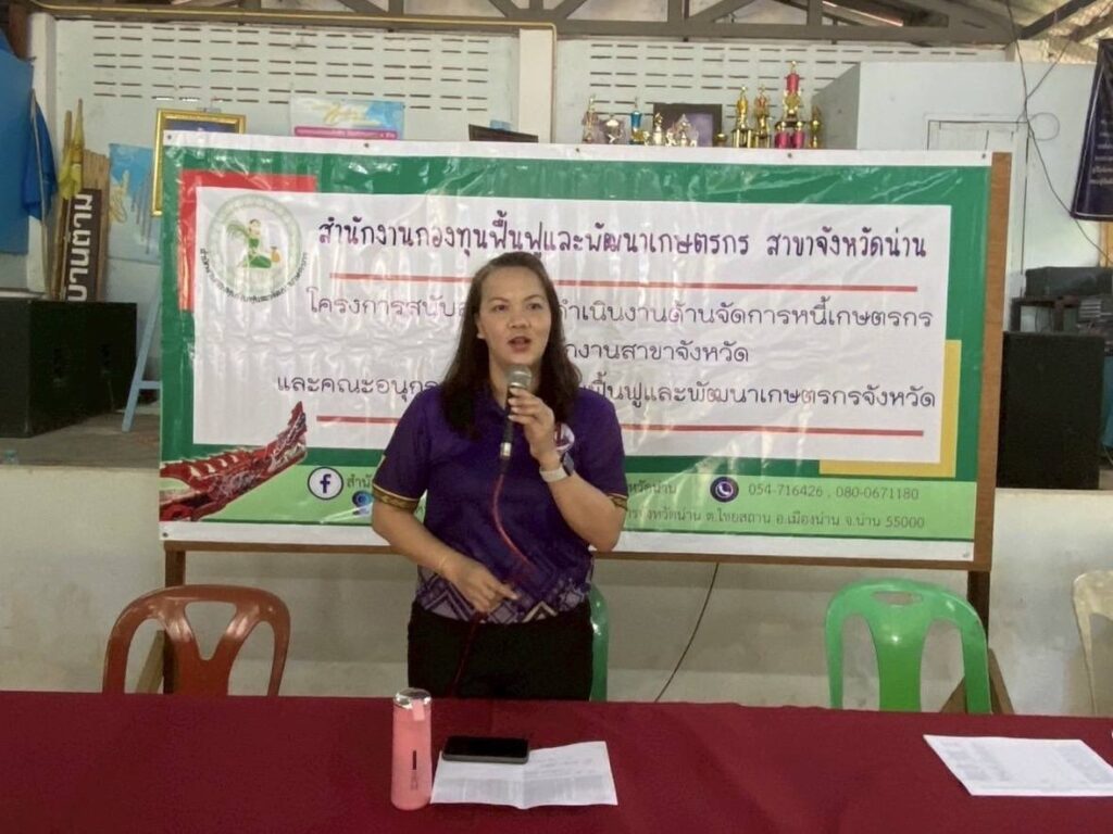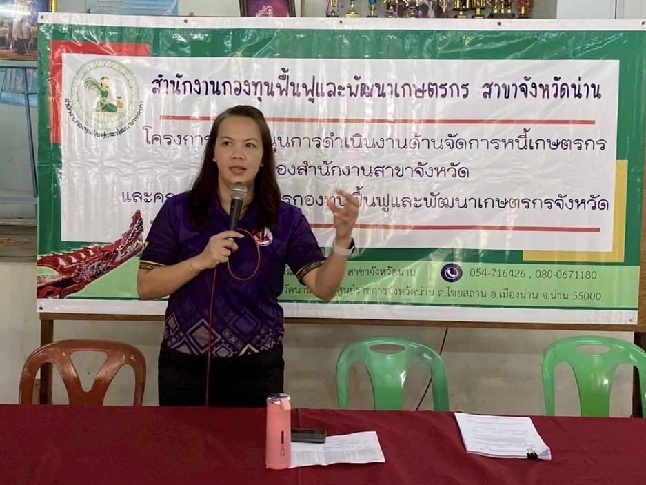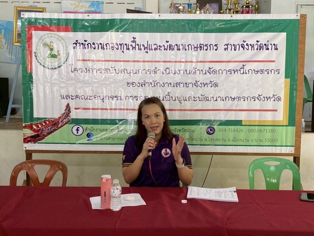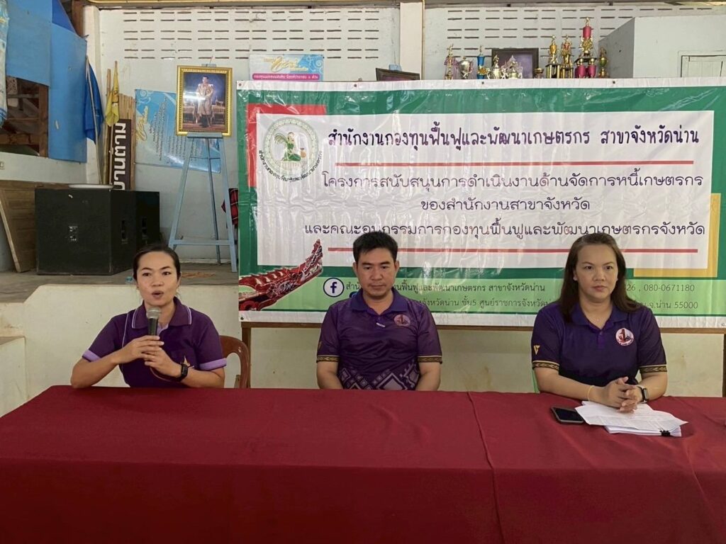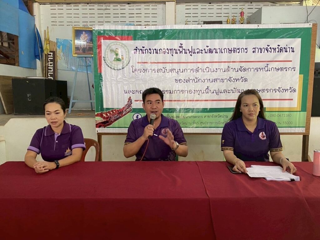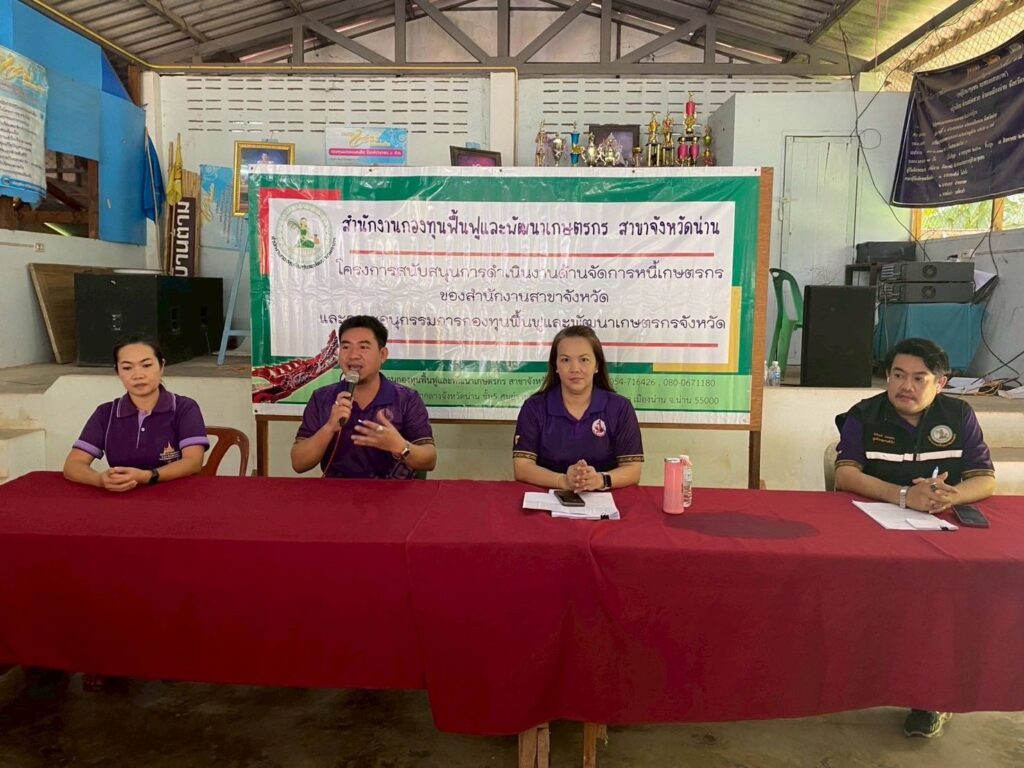 วันที่ 17 กันยายน 2568 เวลา 09.30 น. นางณัติกานต์ บุญเจริญ หัวหน้าสำนักงานกองทุนฟื้นฟูและพัฒนาเกษตรกร สาขาจังหวัดน่าน พร้อมด้วยเจ้าหน้าที่สำนักงาน ลงพื้นที่อำเภอเมืองน่านเพื่อจัดเวทีสร้างความเข้าใจแก่เกษตรกรและผู้เกี่ยวข้อง ตามโครงการสนับสนุนการดำเนินงานด้านการจัดการหนี้เกษตรกรของสำนักงานสาขาจังหวัดและคณะอนุกรรมการกองทุนฟื้นฟูและพัฒนาเกษตรกรจังหวัด กิจกรรม สร้างความเข้าใจแนวทางการจัดการหนี้ของเกษตรกรและเจรจาขอชำระหนี้กับสถาบันการเงิน